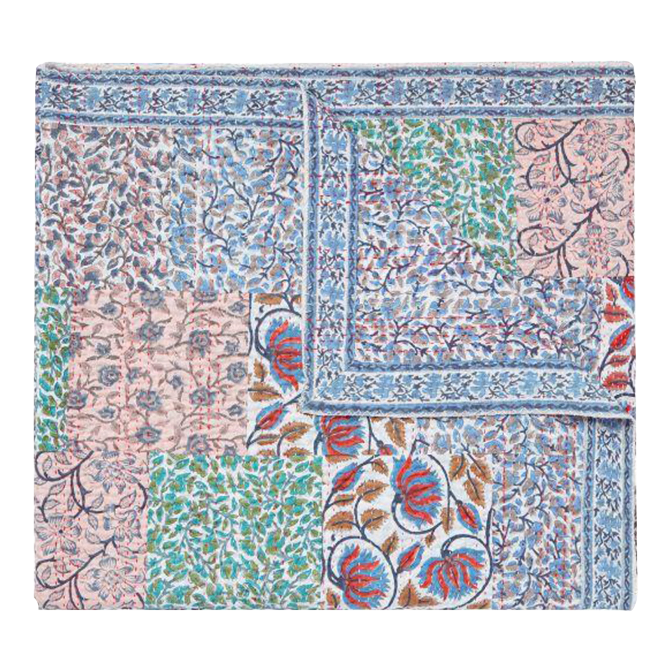 The Aizel hand stitched quilt features a patchwork assortment of soft, yet vibrant hand block printed floral designs in blues, β¦