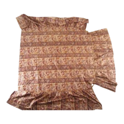 A wonderful, early 19th century printed glazed chintz bed cover or spread. Striped floral print in brown tones, with attached skirt, adjustable corner ties, back is silk printed with blue flowers. Excellent condition – this textile is in good state of preservation – only a few minor small losses – does not detract. Perfect for collectors of Lindsey Woolsey, antique quilts and other textiles. Provenance – from Portsmouth, NH. Measures 108″ x 96″.