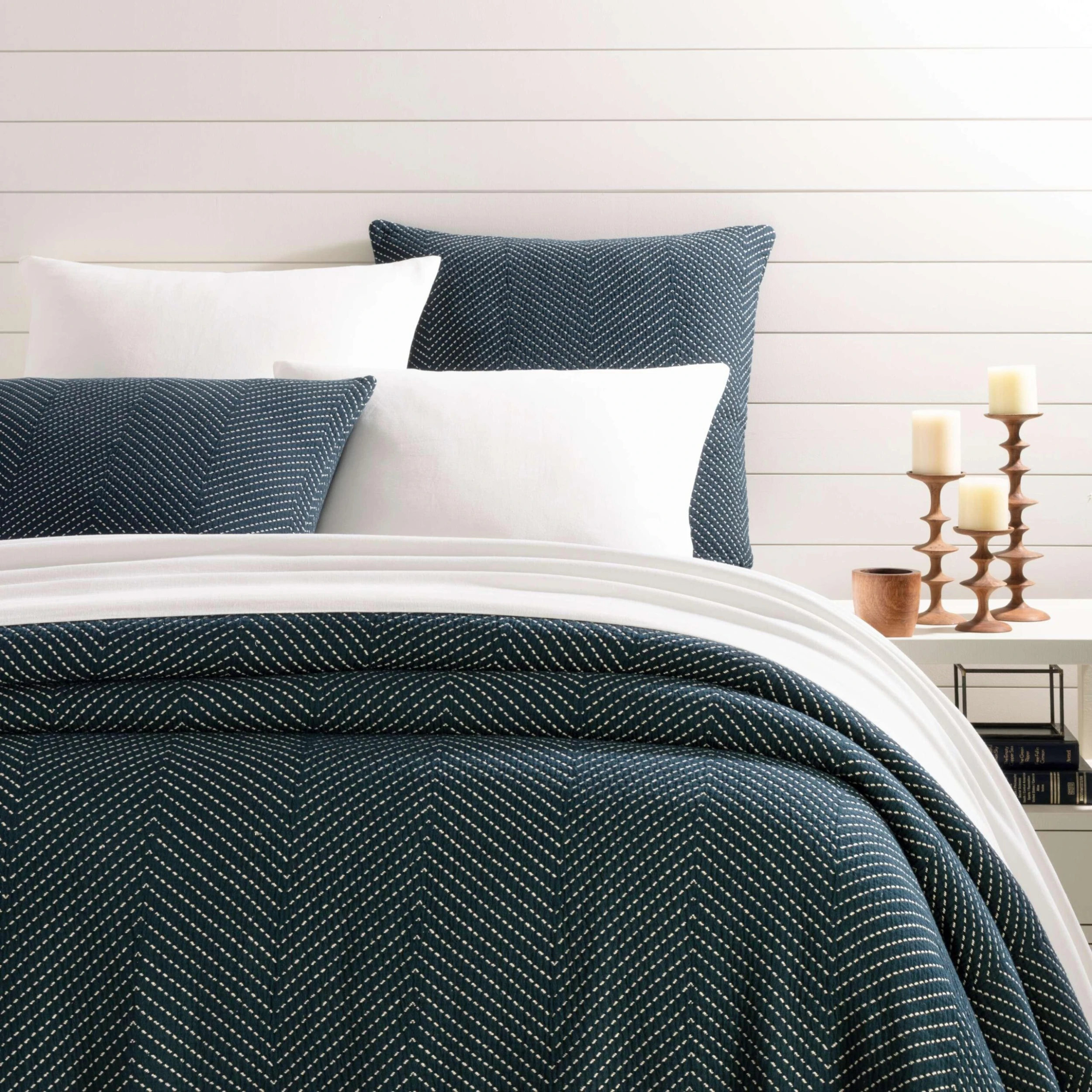 Textured and lofty with a soft hand, this double layered, pick-stitch chevron coverlet and matching sham is sure to become an everyday essential. A lightweight cotton, year-round bedding layer with sumptuous texture, it flies solo in the warmer months but plays well, teamed with other layers, during the colder months.