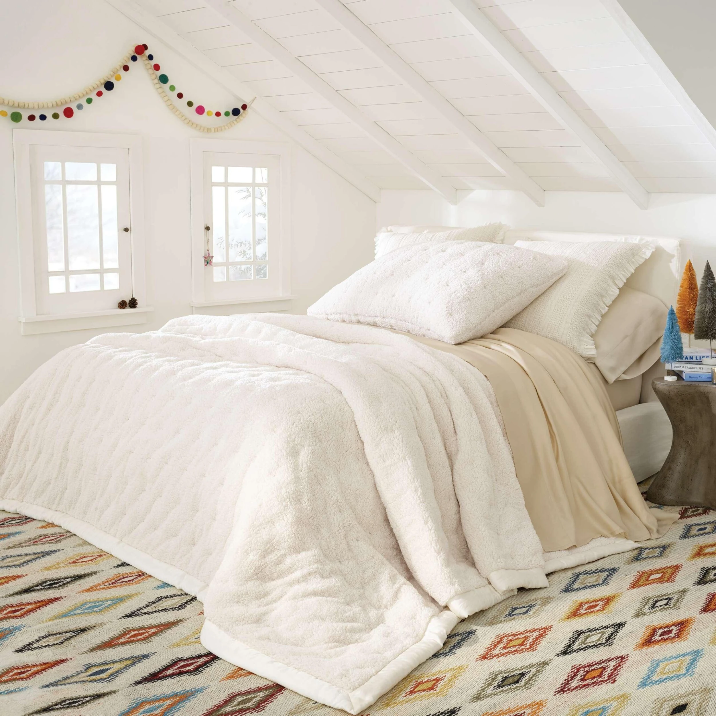 Puff is our magical, new “One-derful and Done” bedding solution: One “puffy-fluff” shake in the morning and the bed is magically made. Transcend the moment and fall into the deepest of billowy soft dreams with our cushy marshmallow fleecey puff. Tufted at 4″ intervals for max-air puffiness with a coordinating silken solid back, this makes a gorgeous layer for a winter white bed.