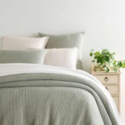 Precisely crafted Forest Green pick stitch accentuates the yarn dyed cotton jacquard of this reversible Evergreen matelassé coverlet and matching sham. The double layer delivers lightweight warmth and a soft hand. Reverses to solid back.