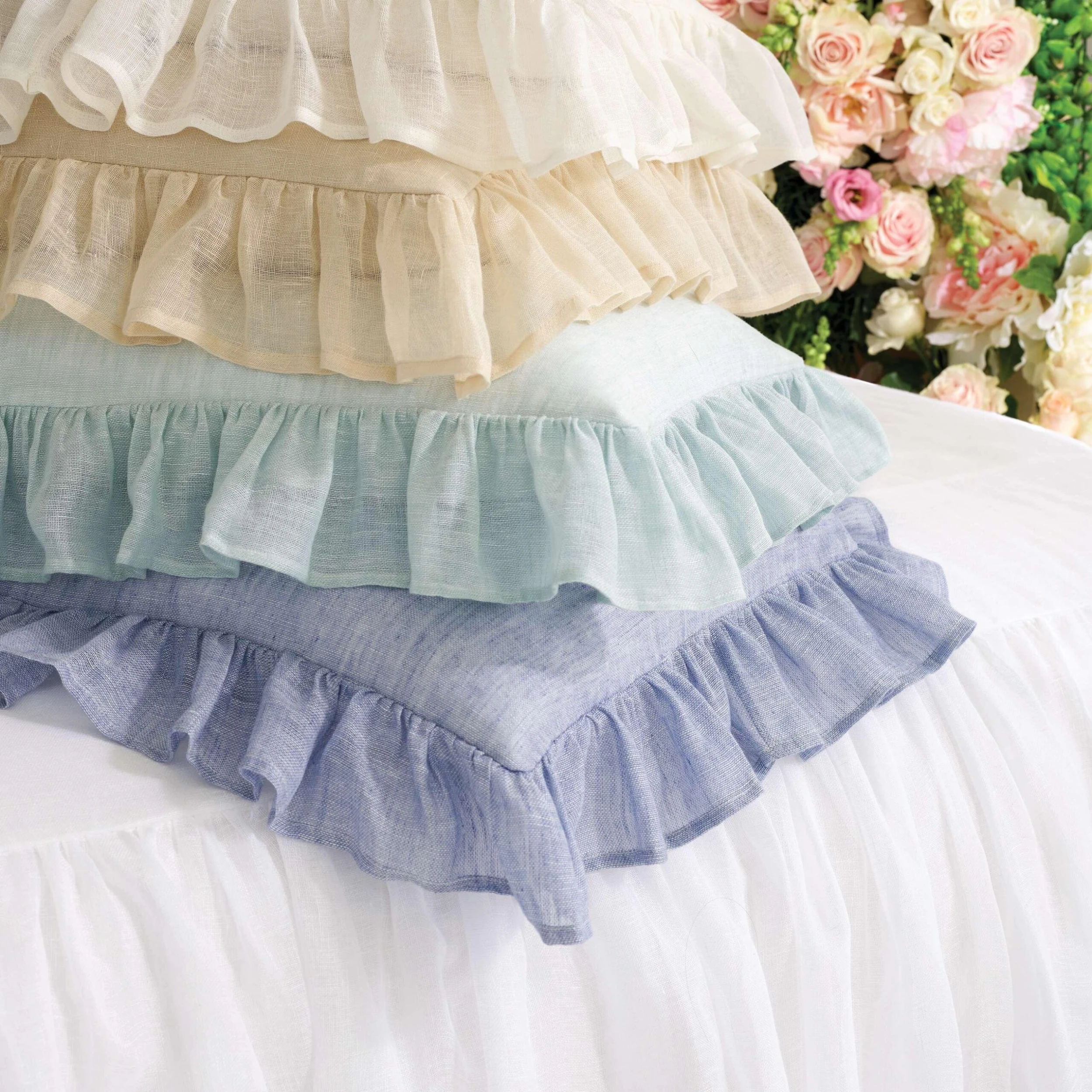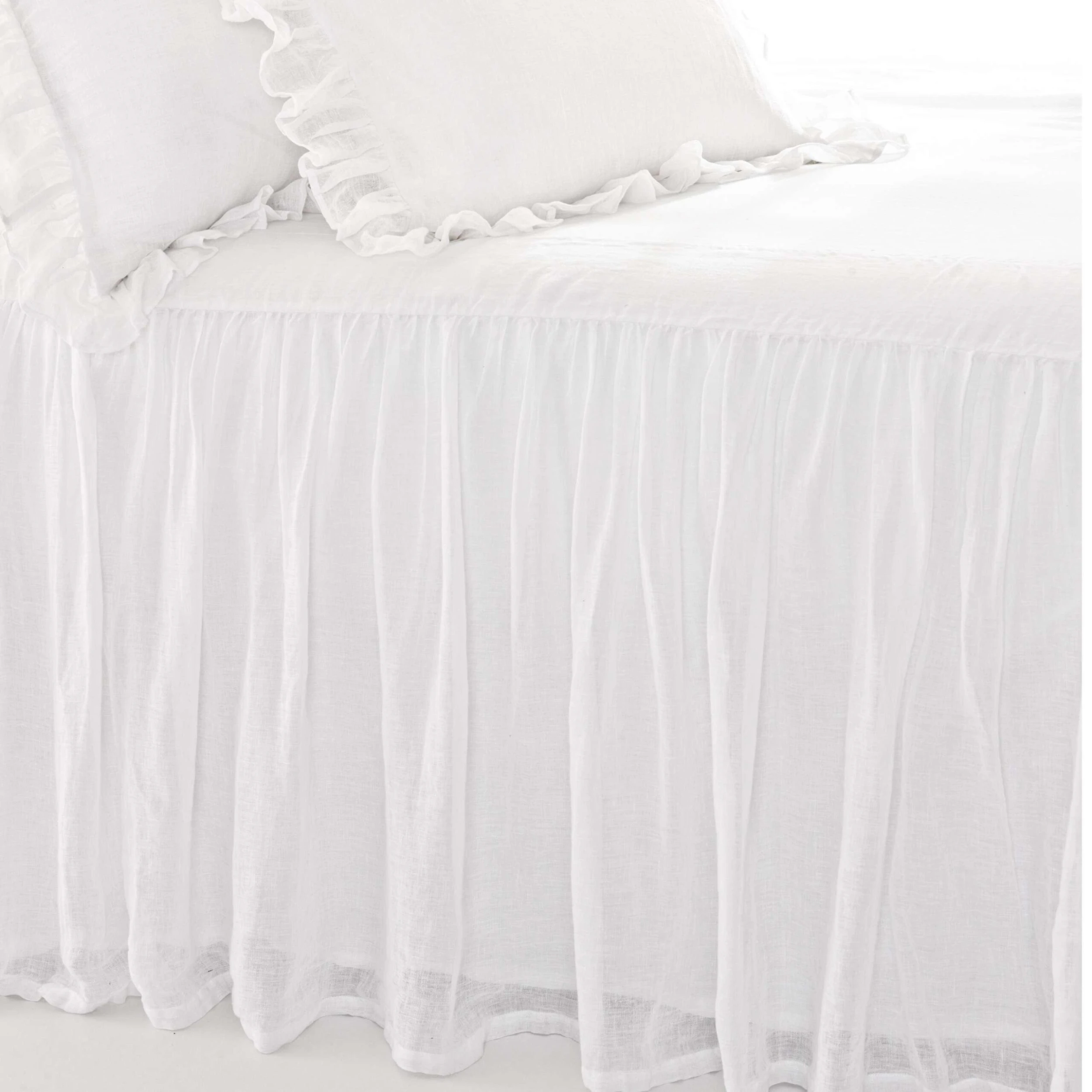 Loosely woven with a subtle translucence, this light-as-air, beautifully draped linen bedspread is as gracious as its Southern inspiration. Cotton lined top with lined, 30″ gathered skirt on three sides.