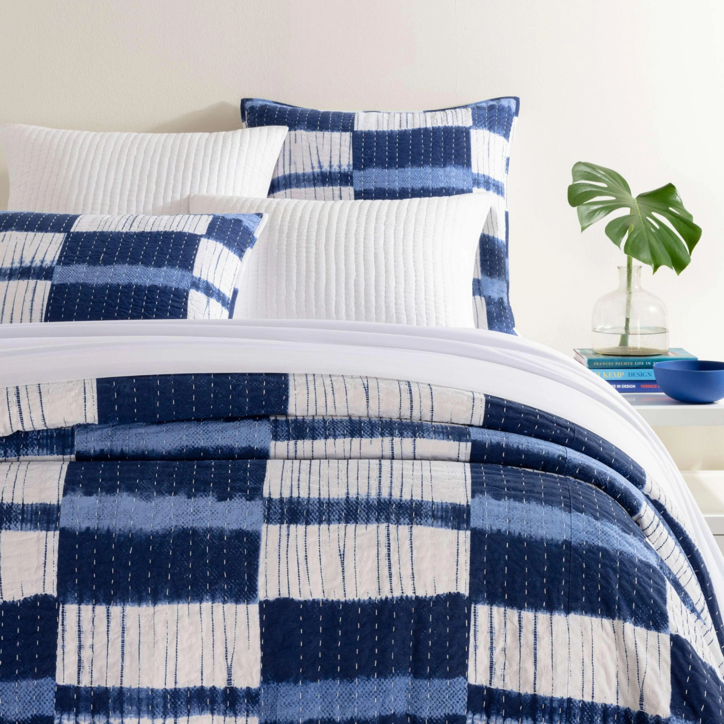 Modern plaid design inspired by traditional Japanese folding and pleating resist dye technique. Reproduced in monochrome shades of Indigo on a white cotton ground. Lightweight coverlet and shams have a double layer of fabric with a light kantha stitch quilting, reversing to a solid white back.