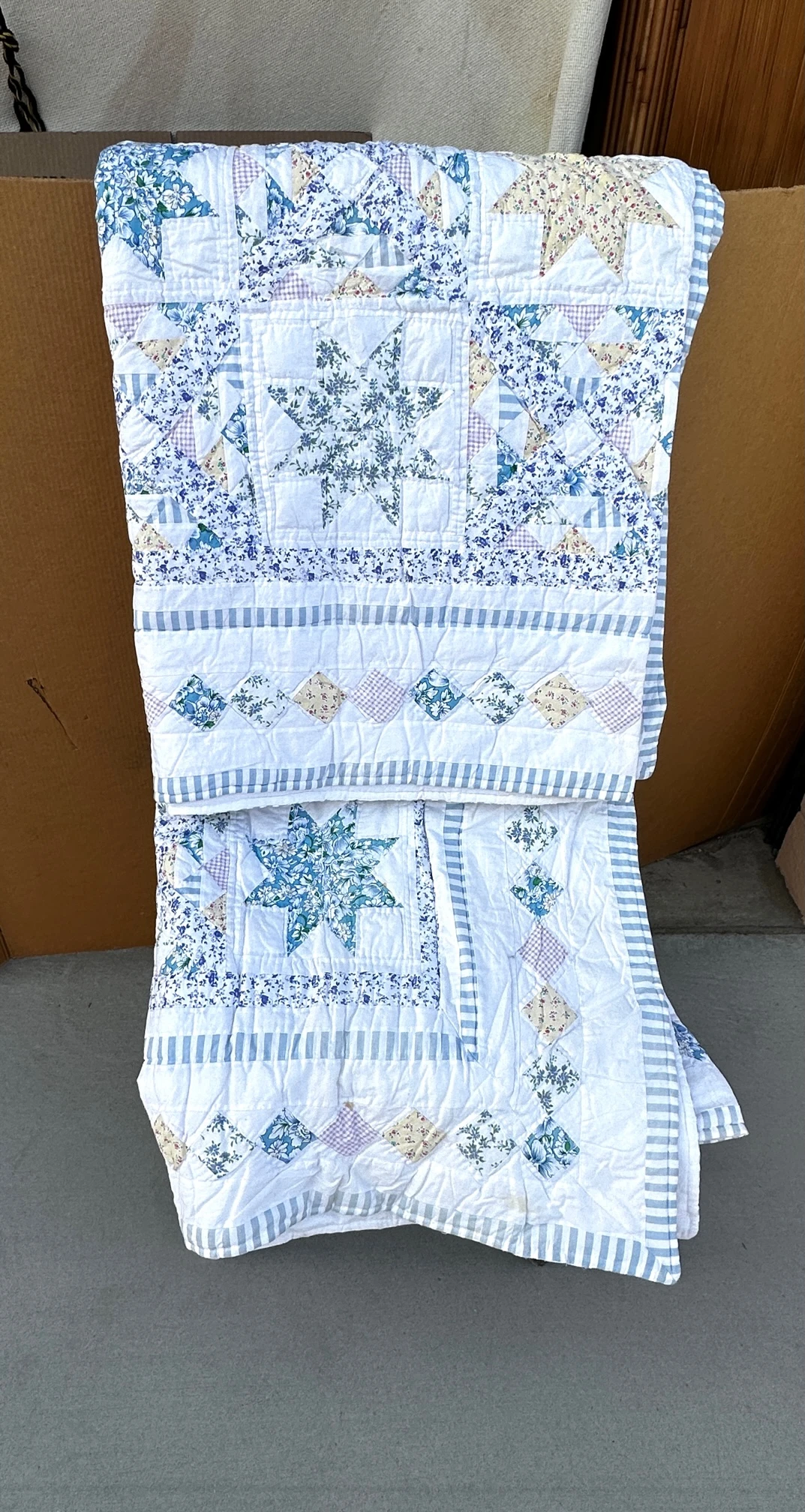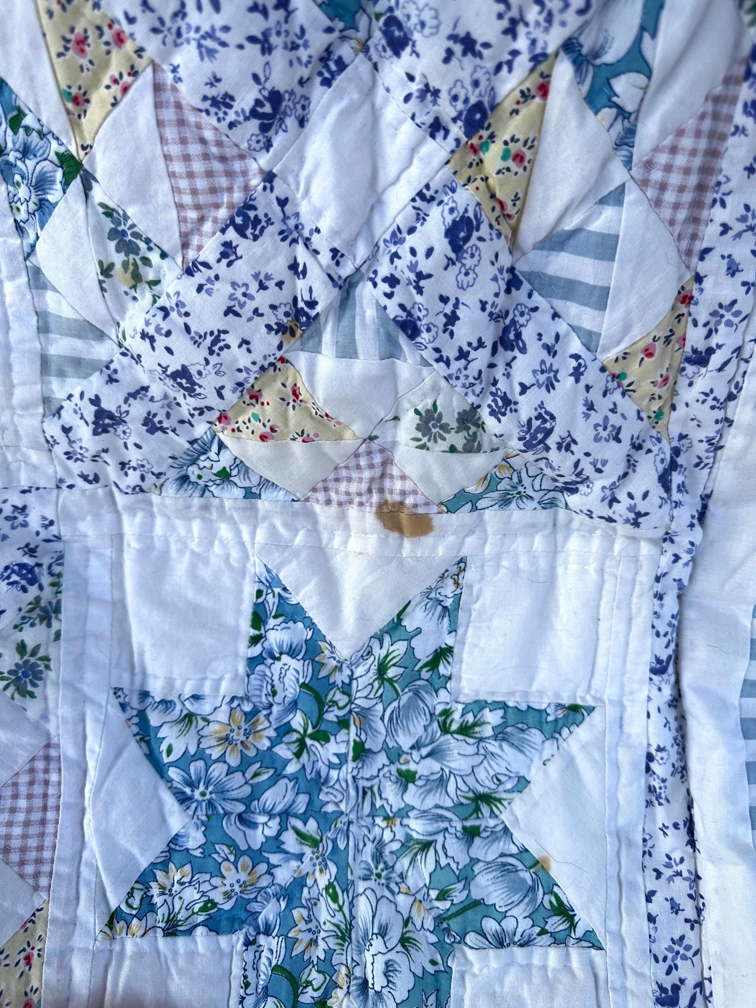 Vintage quilt that will add some summery farmhouse flair to your bedding. Quilt is designed in a star pattern variation, …
