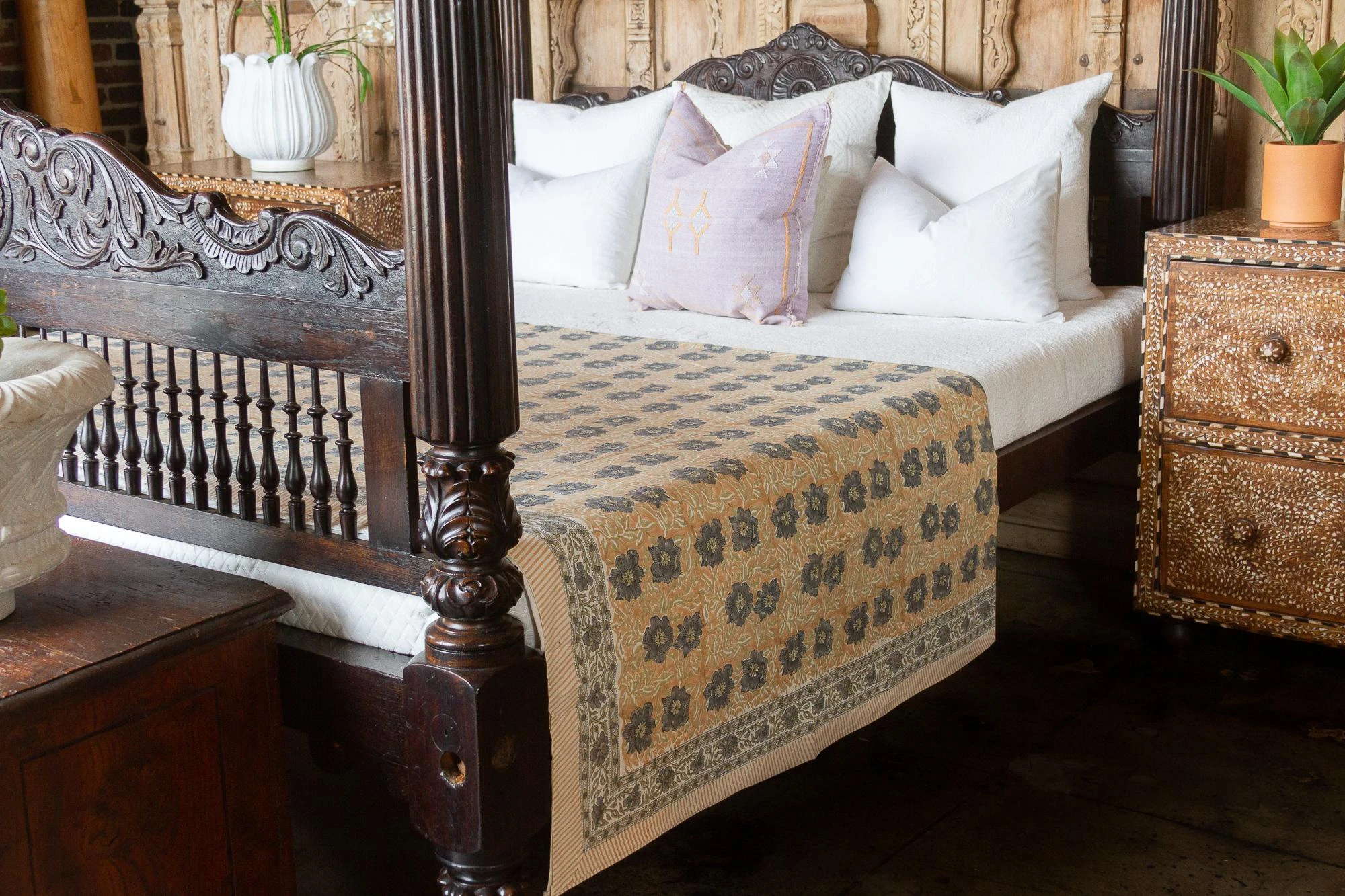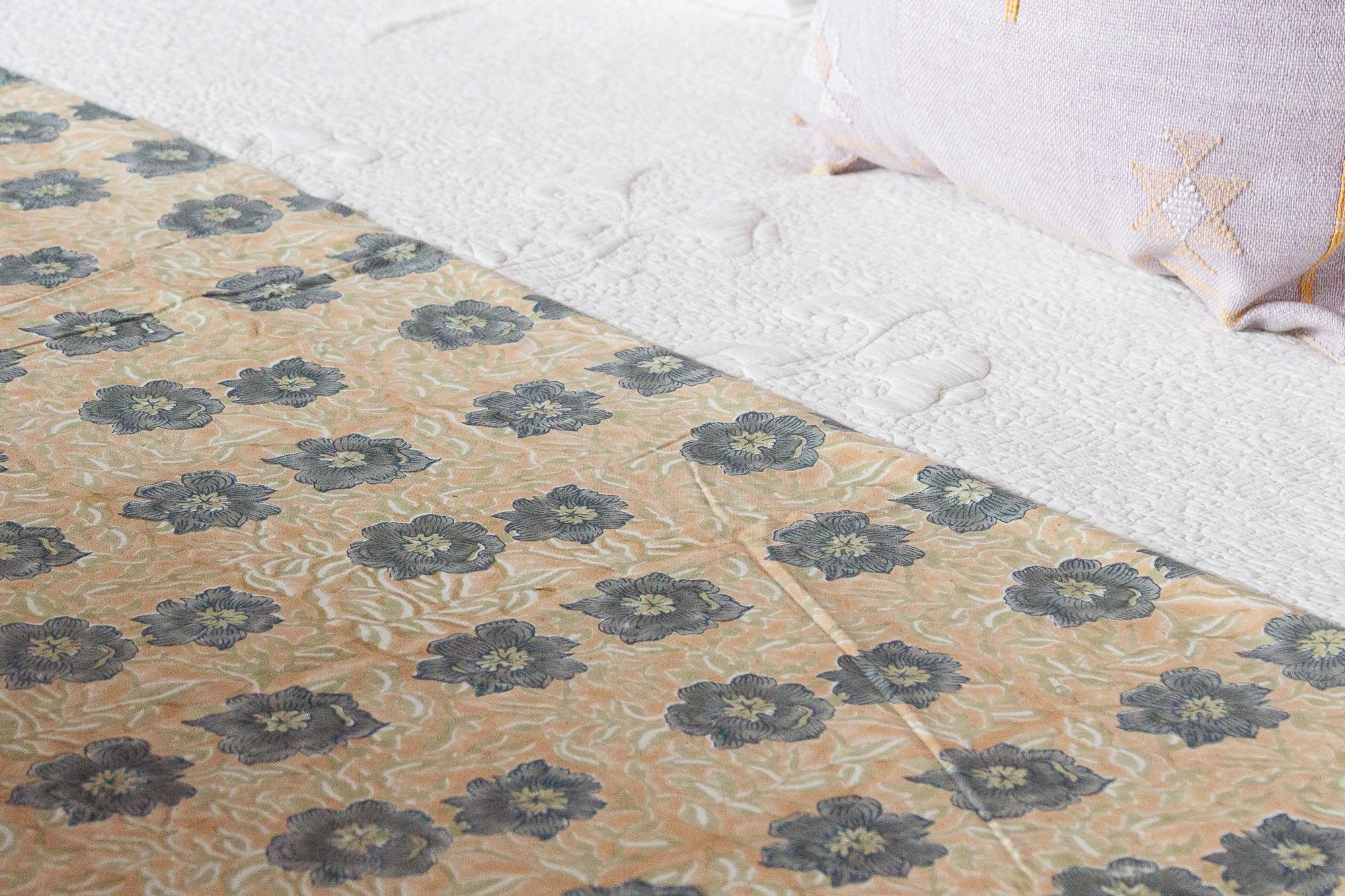 A beautiful anemone floral print bedspread, this coverlet adds a lively and bohemian touch to your bedroom decor. Made from 100% cotton each bedspread is handcrafted using the age old Indian technique of hand block printing. The art of block printing is a method of using a drawn design to create a hand carved wooden block template to stamp the design onto the fabric, it is an Indian artistry that has been around since the 14th century.